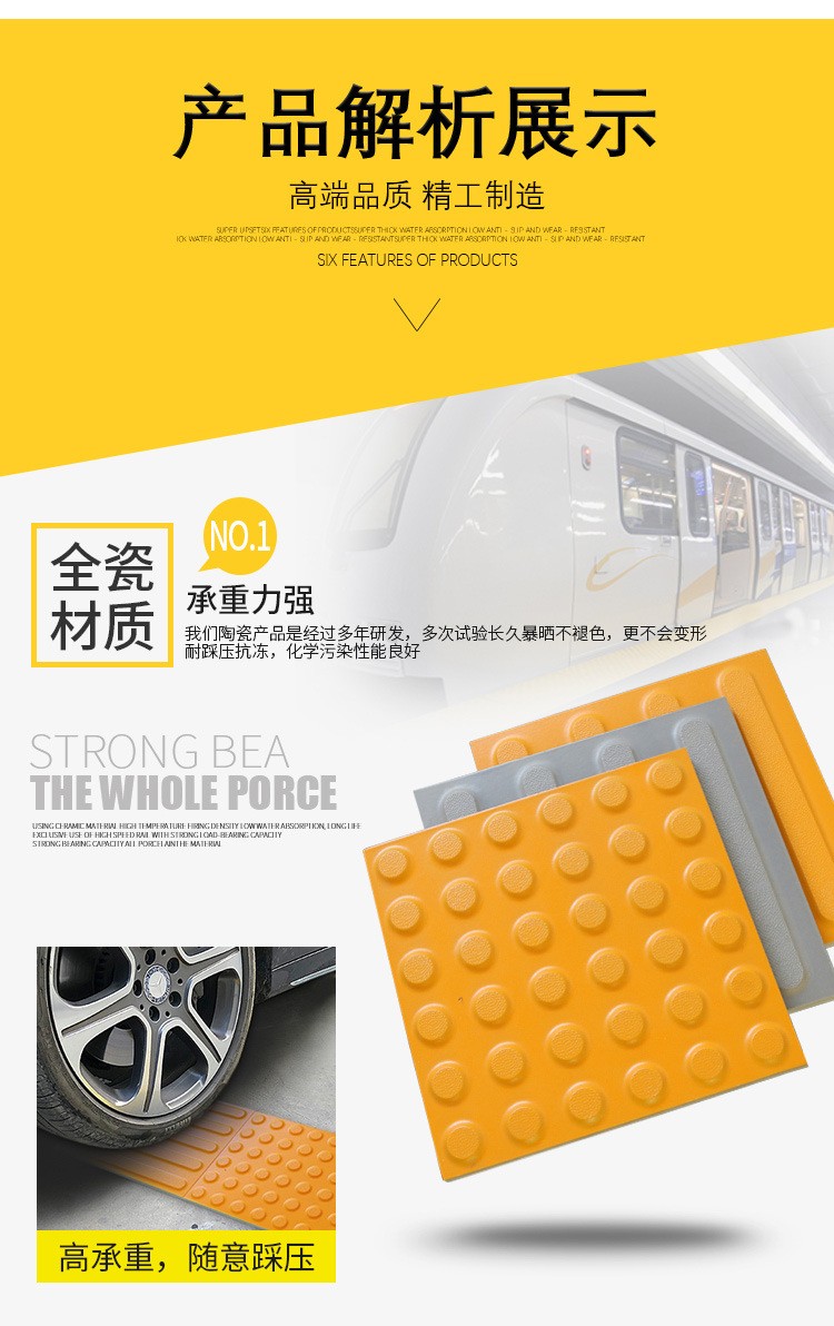 火車站站臺止步線國家標(biāo)準(zhǔn)寬度是600毫米寬,所以一般盲道磚規(guī)格都是600毫米的倍數(shù),比如有常用的300*300*20.300*300*25,以及400*400;300*400等。 這種盲道磚的成型方法是干粉制胚,壓制成型。